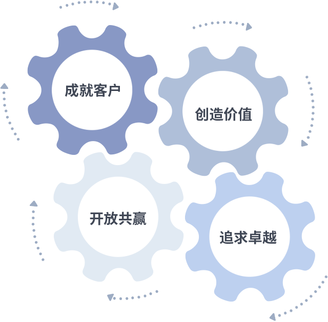 成就客户是一切决策的出发点,,,创造价值是衡量所有工作的标准,,,追求卓越是我们做事做人的态度,,,,开放共赢是我们的格局也是最终的结果。。。价值观的齿轮环环相扣,,,推动着组织里的每个人不断向前。。。。